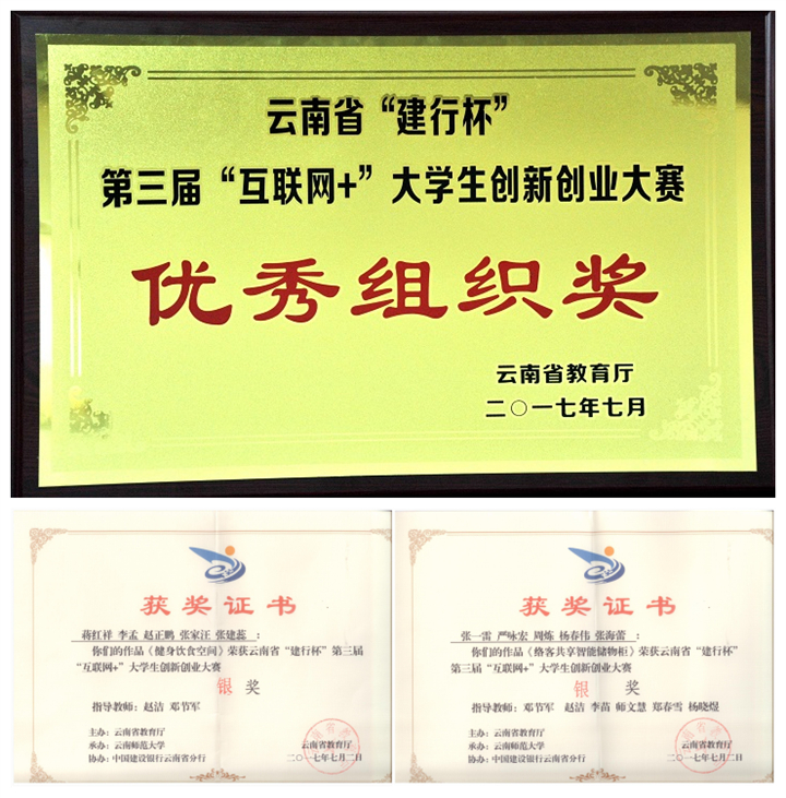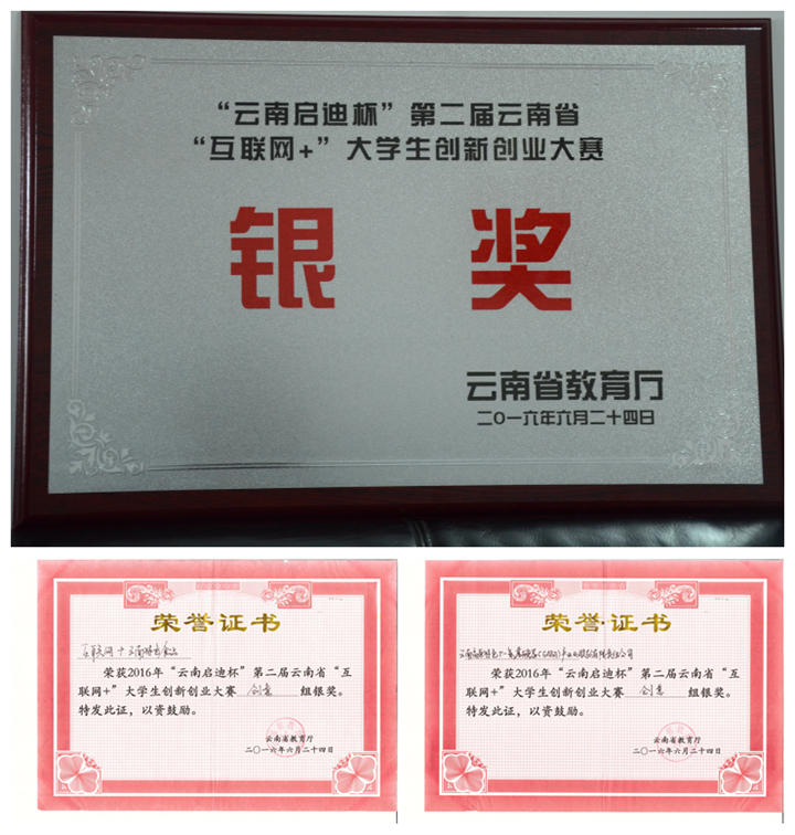 2016年我校分别参加“云南启迪杯”第二届云南省“互联网+”大学生创新创业大赛、“挑战杯——彩虹人生”“创青春”全国职业学校创新创效创业大赛,荣获:
