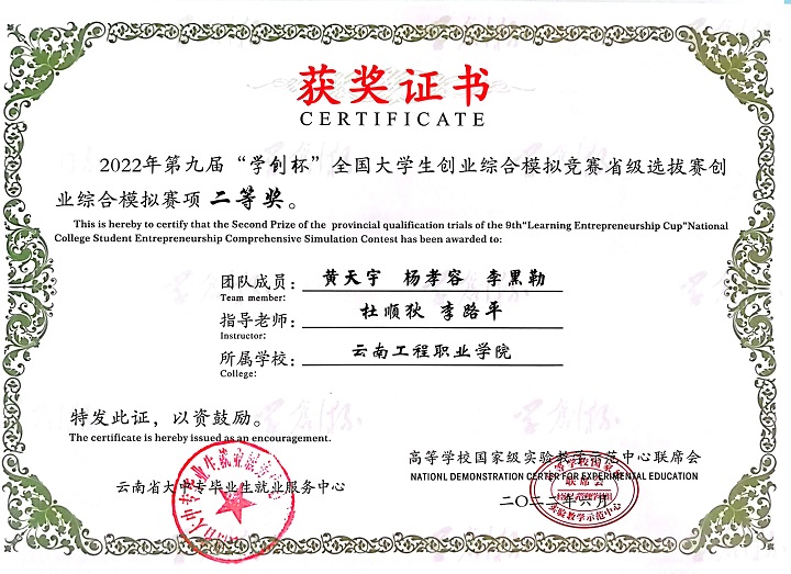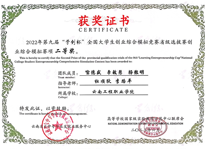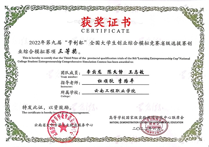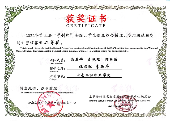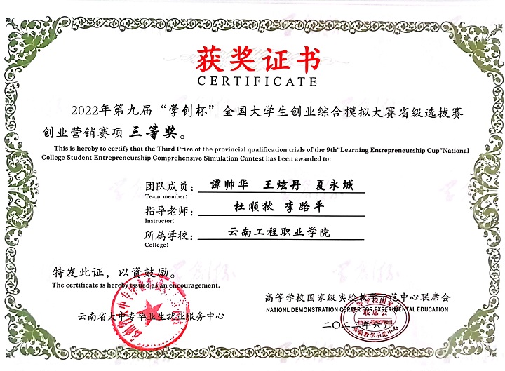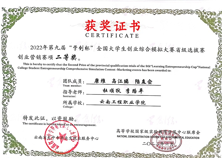 本届大赛云南赛区比赛于2022年3月启动,共有53所高校、154支队伍参加创业综合模拟竞赛,45所高校、129支队伍参加创业营销专项竞赛。学校自启动本届赛事以来,学校领导高度重视,并于2022年4月28日举办了云南工程职业学院“铭鼎杯”学创杯校级赛,通过校赛层层选拔,共推荐了由经济信息学院杜顺狄、李路平老师共同指导的六支队伍参加云南省“学创杯”省级选拔赛,参加省赛的六支队伍从校赛到省赛一个多月的时间里,指导老师不断地对参赛选手进行培训、答疑、团队训练,在参加省赛过程中,同学分工明确、沉着冷静、协调互助,在四个小时的紧张决策和操作中始终保持最佳的状态。最后系统根据各参赛团队第四季度末的经营业绩自动生成比赛结果,产生各项奖项。