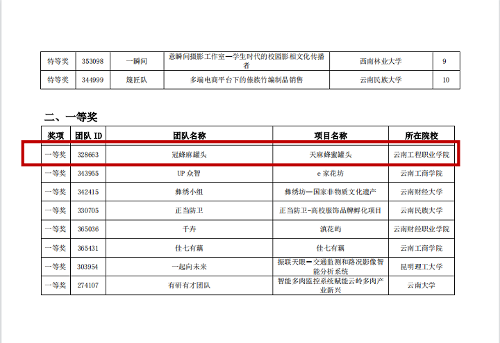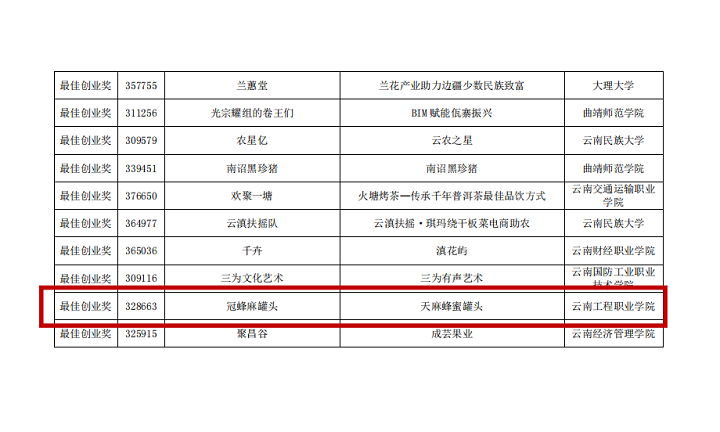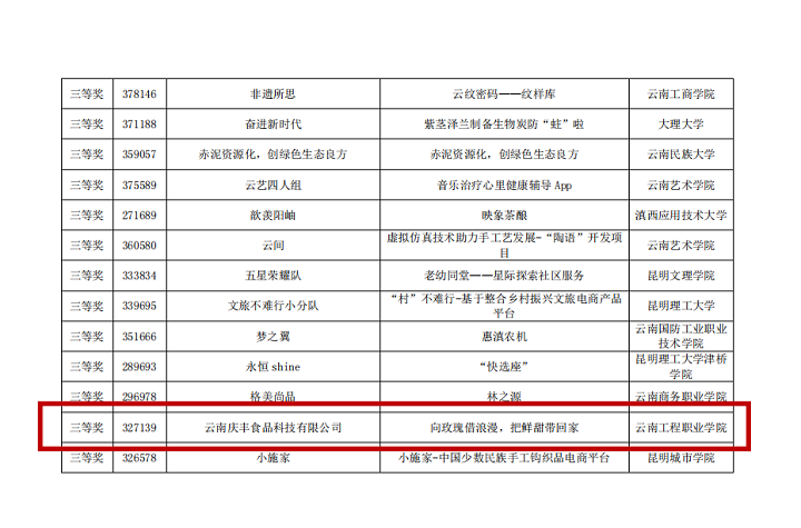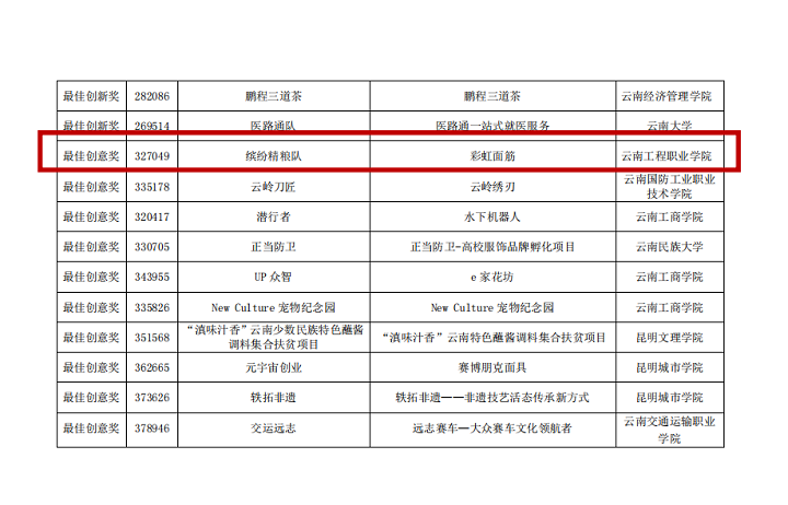 6月25日,学校参赛选手经过赛前充分的准备,来到了云南民族大学省赛赛场。经过一系列激烈的角逐,学校医学技术学院《天麻蜂蜜罐头》项目荣获省级一等奖、最佳创业奖;工程技术学院《向玫瑰借浪漫,把鲜甜带回家》项目荣获省级三等奖;教育学院《彩虹面筋》项目荣获最佳创意奖;学校项目指导教师张成彦老师和蒋玮老师被评为省赛“优秀指导教师”。