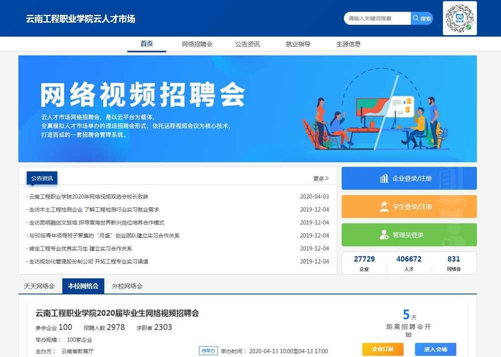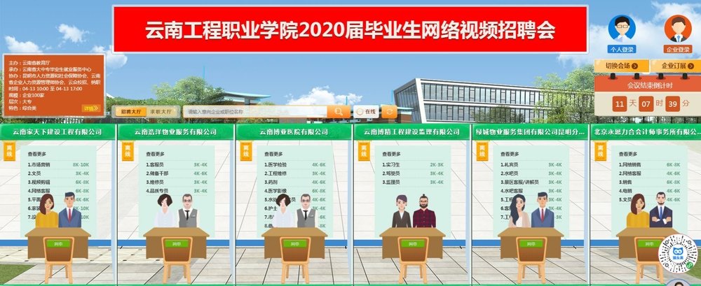 在新冠肺炎疫情防控工作的关键阶段,我校与众多学校一样也开启网络课程,倒逼老师转型“主播”并运用各种网络屏幕工具确保同学们宅家抗疫不停学不掉队。但2020届毕业生因学习及求职计划受影响均面临着巨大求职压力或处于迷茫状态,而企业逐渐复工之际也面临着用工荒的局面,学校作为人才培养输出基地,不仅就业指导活动不可缺席,更需做好毕业生人才与企业单位对接的重要桥梁联系工作。因此,我校根据党中央、国和务院云南省委、省政府、省教育厅的统一部署及要求,为确保2020届毕业生求职就业不掉队,满足用人单位选才需求,通过云南工程职业学院就业创业工作处公众号、云南工程职业学院云人才市场及相关网络工具向相关企业单位发送《云南工程职业学院2020届毕业生网络视频双选会邀请函》,诚邀各行业企事业单位参加我校2020年4月13日(星期一)10:00—17:00举办并面向2020届毕业生的春季网络视频双选会。经严审945家报名企业,确定最终邀请到适格参会企业300家,可为5125名毕业生提供9730个岗位。