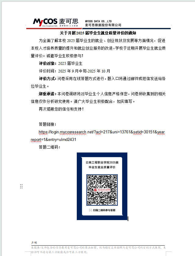 点击下载文件:关于开展2025届毕业生就业质量评价的通知?-云南工程职业学院.doc