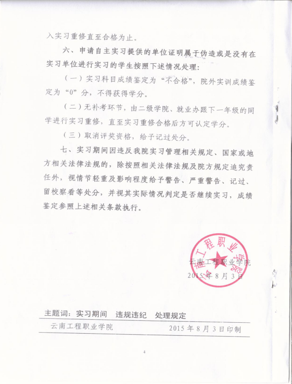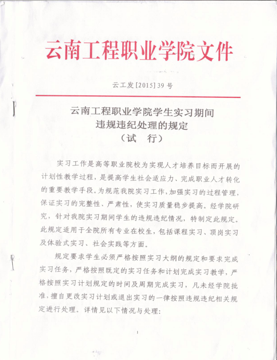 【红头文件】云南工程职业学院学生实习期间违规违纪处理的规定(试行)